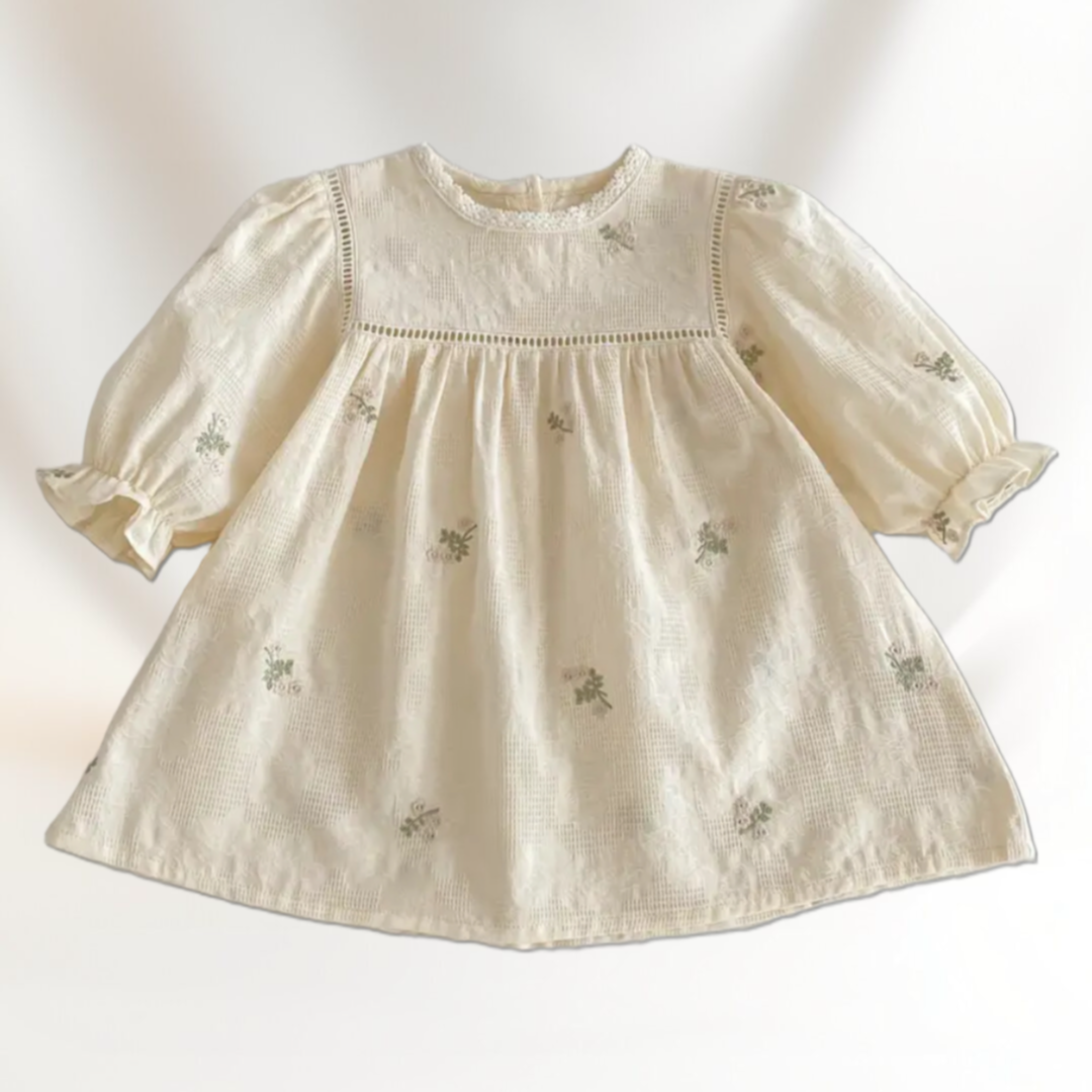 فستان أنيق ودقيق للفتيات الصغيرات مصنوع من القطن بنسبة 100% بأكمام طويلة وتفاصيل دانتيل بسيطة
