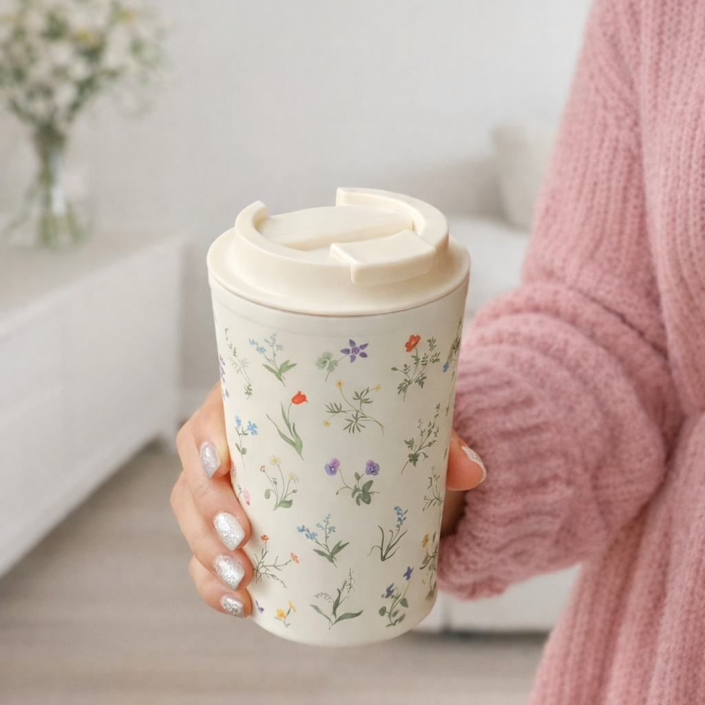 كوب قهوة مزين بزهور برية